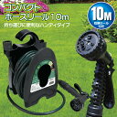 持ち運び便利なハンディタイプ!! ノズルの収納に便利な引っ掛け機能付。散水ホース ノズル セット コンパクト ホースリール 10m ブラック 長い ロングホース 噴射パターン 切替 強力洗浄 コイル 洗車 園芸 水まき 水やり ガーデニング 掃除 水アカ コンパクト 収納 散水ノズル