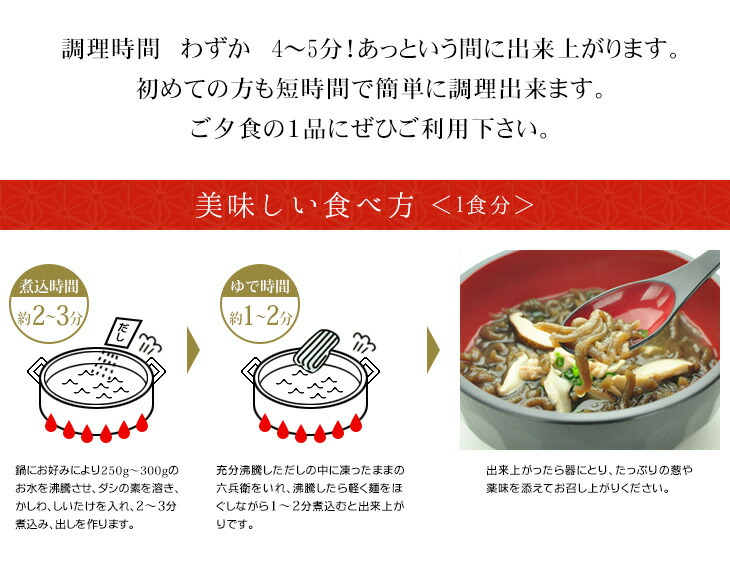 1袋が約1人前で、鶏肉・しいたけ・乾燥ねぎ・七味唐辛子・スープが付いていますのでお料理も簡単!!