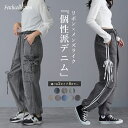 メンズライクデザインにリボン付きの個性派デニム!2typeから選べます♪2typeから選べる リボン付 デニムパンツ | カーゴパンツ リボン レディース ボトムス ワイド パンツ ウエストゴム カジュアル イージーパンツ リラックスパンツ リラックス カジュアル ジーンズ
