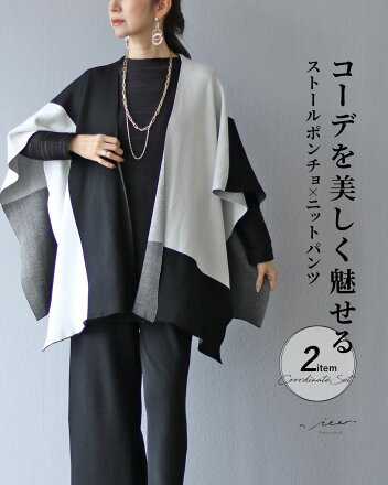「Vieo」セット 40代 50代 60代 レディース ミセス レディースファッション 上品 きれいめ 婦人服 体型カバー 着回し ゆったり フリーサイズ お洒落 大人 コーデを美しく魅せる ストールポンチョ×ニットパンツ【set】 Vieo