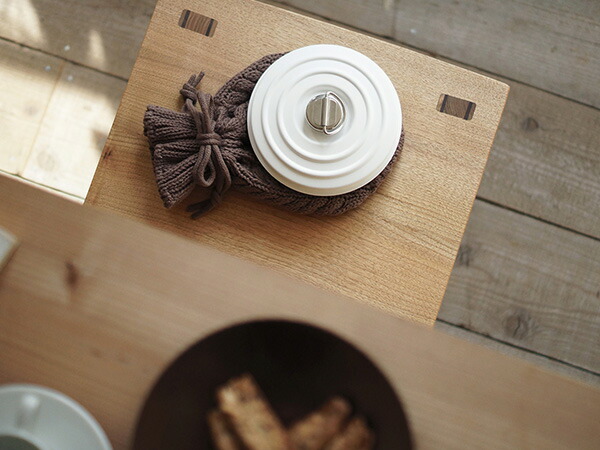 温度変化による本体の変形を抑えるため、独自のビート(凹凸)形状を持たせ、お湯を入れた時でもキャップが閉め易いようステンレスワイヤーの取手をつけました。