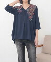 繊細な線画のダリアが美しいコクーンチュニック /【web限定 10%OFF】mash mania コクーンチュニック ダリア【送料無料】/レディース 日本製 柄 トップス 洗える 手洗い可 6分袖 7分袖ドライエックス ネイビー マッシュマニア