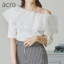 オフショルフリルカットソー【10%オフクーポン有】【P5倍】【SALE】レディース トップス フリル カットソー 半袖 チェック 柄 ブラックホワイト ブラック ホワイト 黒 《acro》オフショルフリルカットソー