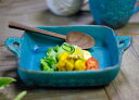 パーティーシーンに最適 大きな角皿 大皿、オードブル皿益子焼 ガーデン パーティープレート ターコイズ 花柄 かわいい おしゃれ 陶器 和食器 大皿 角皿 オードブル皿 青緑 トルコブルー ブルー (食洗機対応 電子レンジ使用可) ギフト