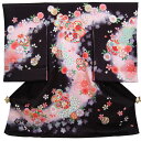 フードセットプレゼント!送料無料♪正絹初着(お宮参り着物・産着)女の子「黒地に花車とピンクの花づくし」