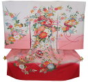フードセットプレゼント!送料無料♪正絹初着(お宮参り着物・産着)女の子「白地に紅型調・束ね熨斗に鈴と花」【10P25Oct14】