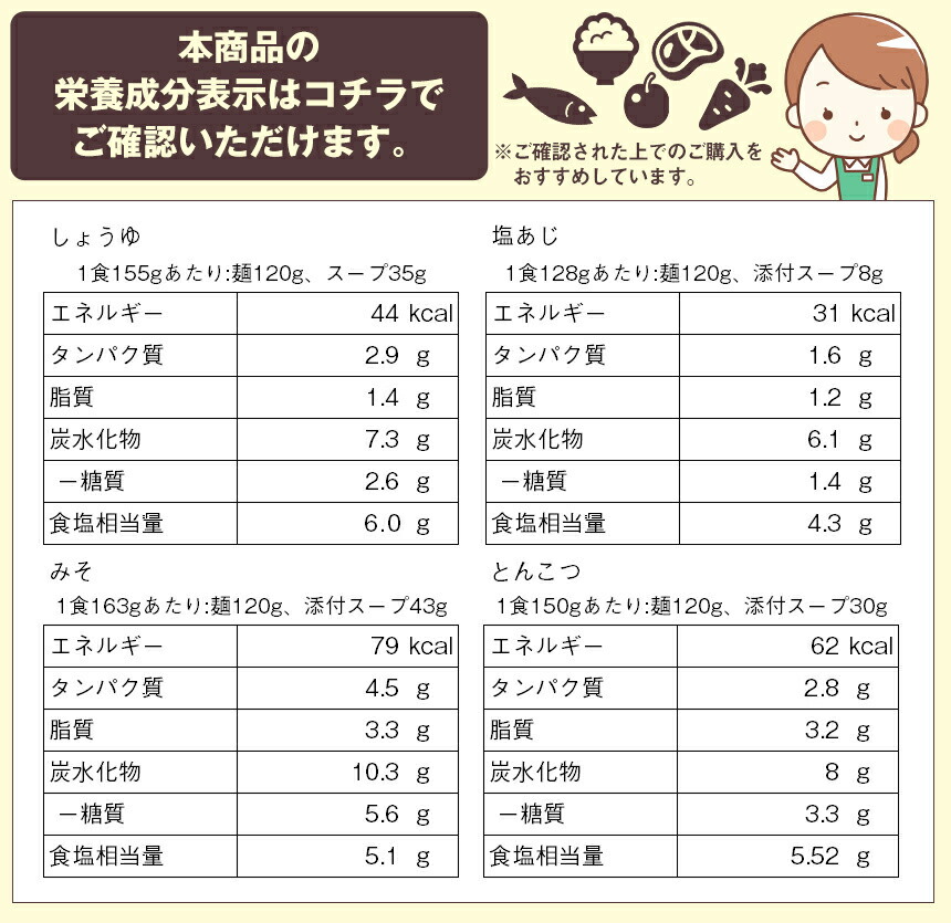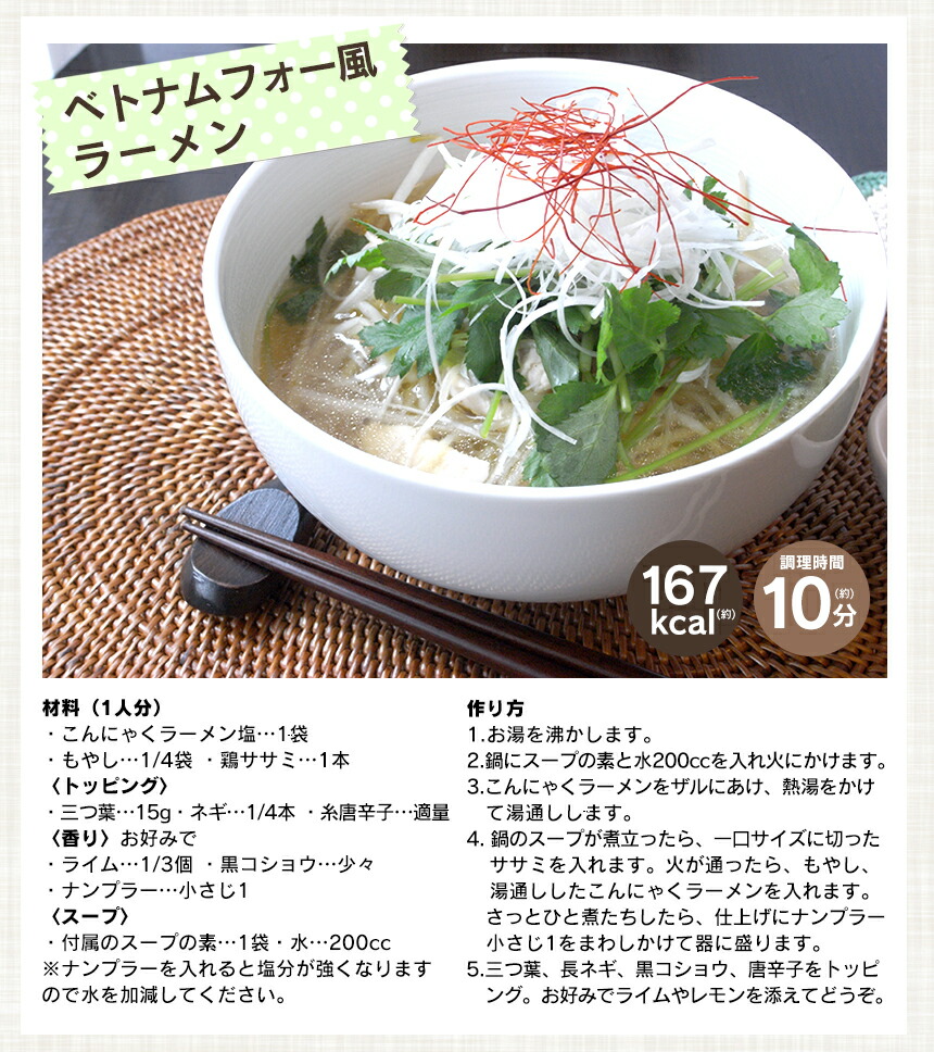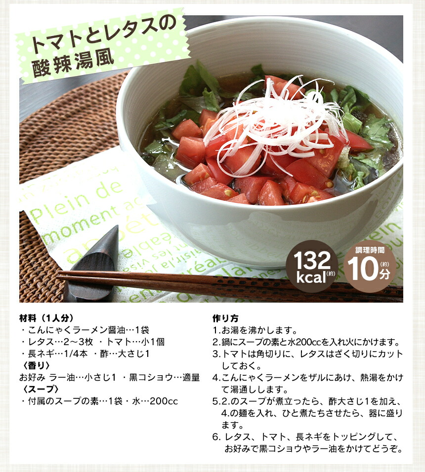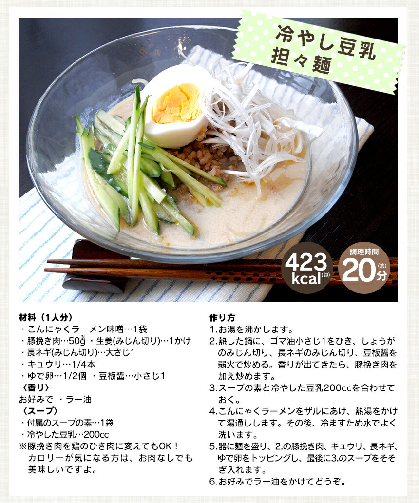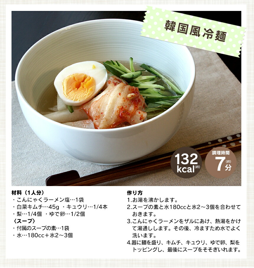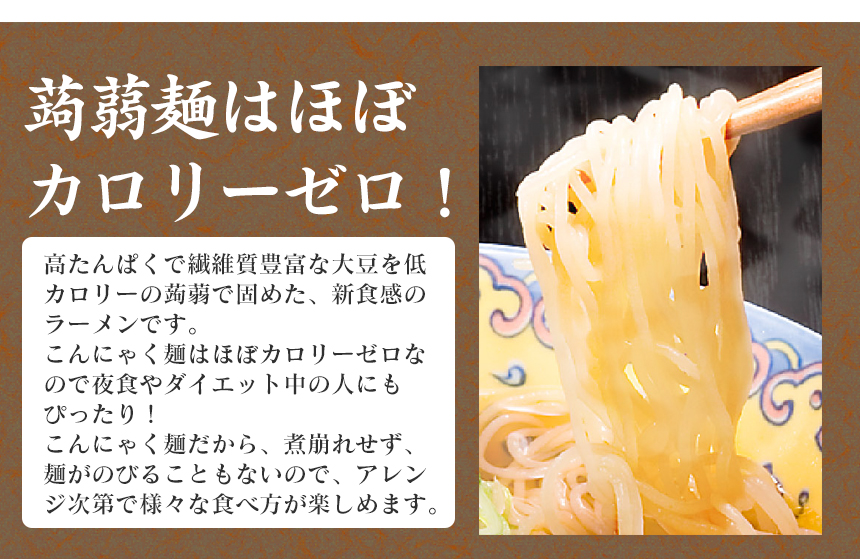 スープまで飲んでも27-79kcal(※具材は含みません)でダイエットや食事制限、カロリー制限のある方にピッタリ!高たんぱくで繊維質豊富な大豆を低カロリーの蒟蒻で固めた、新食感のラーメンです。こんにゃく麺だから、煮崩れせず、麺がのびることもないので、アレンジ次第で様々な食べ方が楽しめます!! |