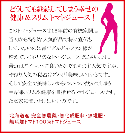 当店の多くのおなじみさんはこのトマトジュースで健康的に美活しています。