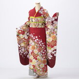 【中古】【購入品】振袖 フルセット Lサイズ 古典柄 赤・ワイン系 成人式 着物 リユース 状態:A 販売 結婚式 卒業式 結納 10929